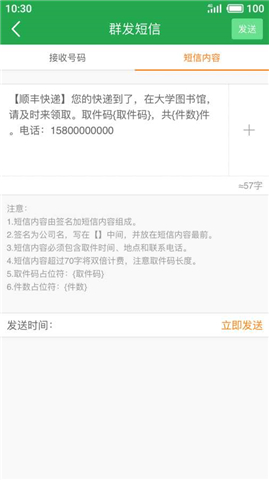 快递短信宝专门为学校、乡镇快递员设计,方便快递员发送取件通知短信,短信由106平台发送,发送稳定快速,支持回复,可以加入取件码、快递包裹数量。短信不会被屏蔽,支持语音输入号码,近期将加入扫描识别,短信内容模版云端保存,免去频繁输入短信内容,价格最低只要3分,还有更多优惠活动。【软件特色】