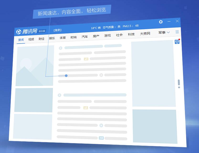 腾讯网迷你版现在推出独立的电脑客户端了,之前给大家的印象一直是登录QQ时候的弹窗新闻,与之前的客户端相比,体积更小,界面更干净,只有和新闻有关的内容。【软件特点】