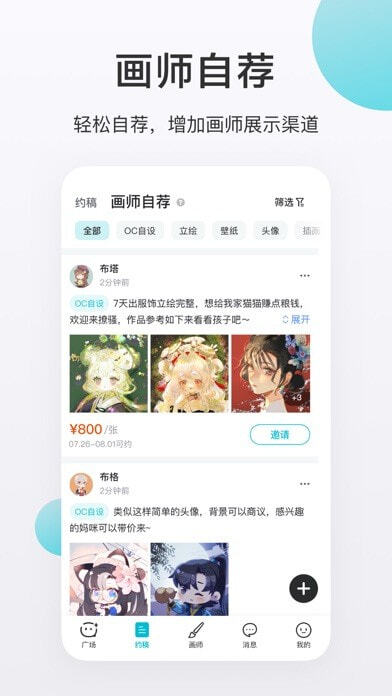 画加,一款备受二次元爱好者喜爱的手机约稿平台。它界面设计简约,功能却十分强大。在画加平台上,用户能够与心仪的画师展开线上一对一交流,顺利完成约稿的全部流程。要是你渴望拥有独一无二的头像,亦或是专属自己的人设,那这款软件你可一定得试试。