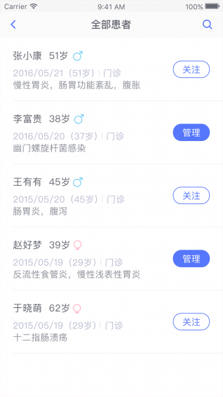 患者管理:实时获取患者就诊信息和病历资料,与院内信息系统保持同步,保证病历资料的一致与完整。分组管理:对您关注的患者进行多维度的分组管理,有效跟踪患者诊疗进程和效果。