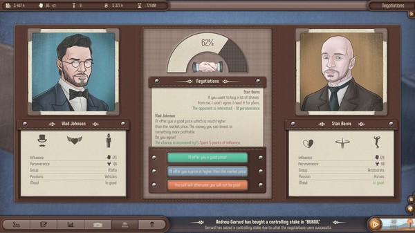 游戏有各种不同类型的公司为您提供股票,如石油、运输和金融。你必须和股东谈判,让他们在你身边,利用你的才能和影响力来摆动他们。