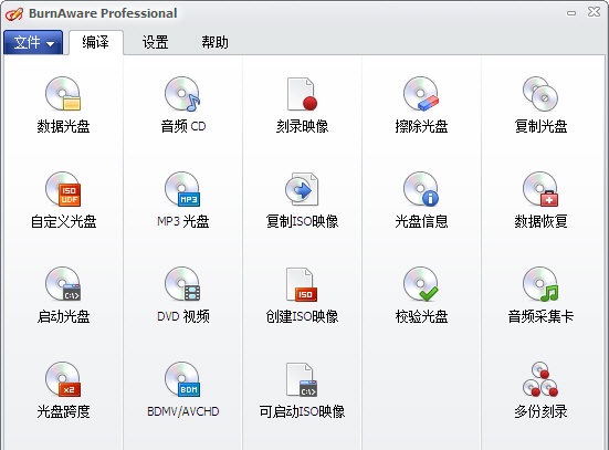 BurnAware Professional 支持几乎所有的光存储媒体,具备良好广泛的硬件兼容性,包括:CD-R/RW、DVD-R/RW、DVD+R/RW、BD-R/RE、HD-DVD-R/RW 和 DVD-RAM。BurnAware Professional 可创建可引导 CD/DVD 光盘;支持命令行脚本自动执行;支持多重区段刻录及追加数据;可创建音频、视频等多媒体光盘;并支持标题和曲目的 CD 文字,包括 Unicode。