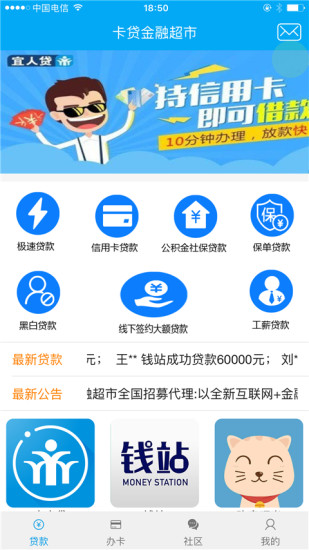 卡贷金融超市是一款互联网金融业务推广软件,卡贷金融app与国内第三方金融平台合作,为各种客户群体提供服务。