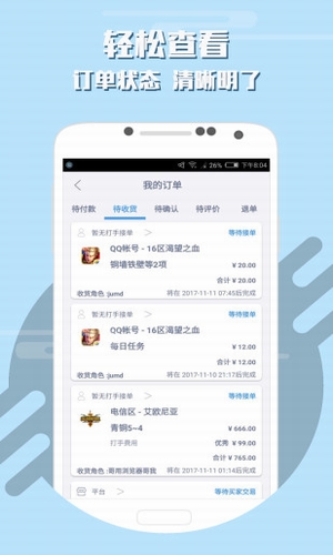 游戏代练app是国内一款专业安全的游戏代练交易担保平台,方便快捷的操作,完整的认证体系,为玩家提供专业安全的平台交易,第三方平台的介入让代练更加安全,为您每一次代练需求保驾护航 ,让您放心是我们追求的动力。主要服务的代练游戏有:英雄联盟代练、lol代练、守望先锋代练、等热门游戏。【软件特点】
