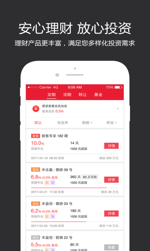 【理财】活期、固收、浮动、基金等理财产品,给您提供丰富的理财选择。