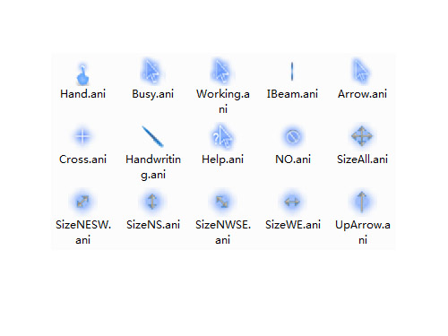 绚丽发光鼠标指针是包含15个基本指针的鼠标指针文件,蓝色风格简洁大方,透明发光效果看上去十分时尚,可用于搭配多种主题