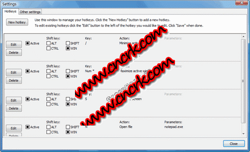 第一次启动程序时一个简单的指南将帮助您设置初始热键。在此之后,您可以在Windows的任何地方使用这个热键。你可以设置热键使窗口最小化,关闭正在运行的应用程序,打开一个文档,保存屏幕截图文件,退出Windows或发送击键到所有活动的窗口