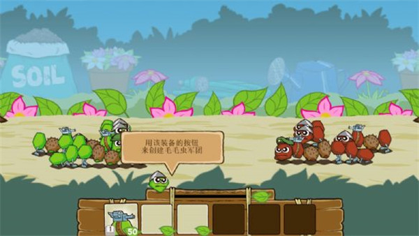 选择各种各样的武器,装甲和支援手段,包括射线枪,火焰喷射器,火箭,粘稠的蜂蜜还有更多。善良的毛毛虫有着血多的朋友,像巫师乌龟和拉里鸟,召唤这些强大的林地盟友与你并肩作战。