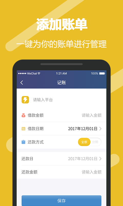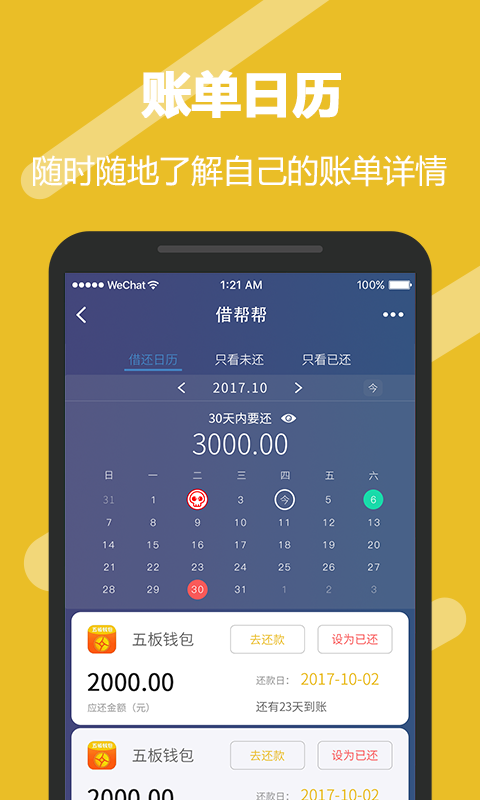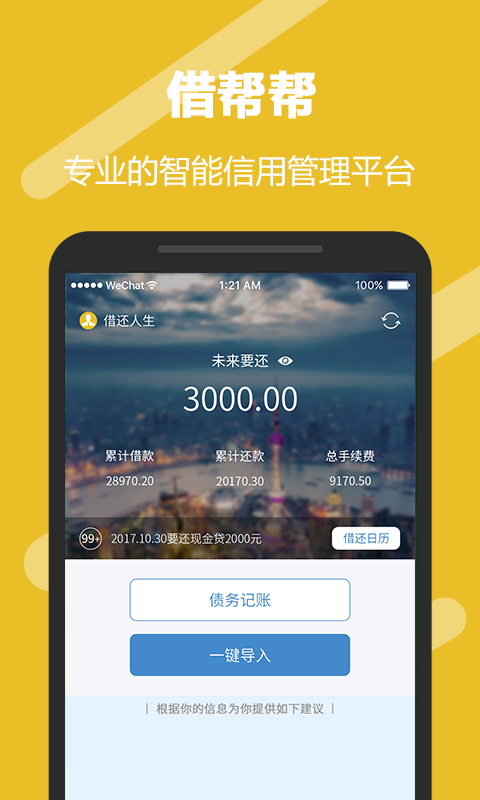 借帮帮是一个为用户提供债务记账服务的智能信用管理工具,包括手动或自动添加债务借还记录和分期账单记录,以及债务还款提醒和债务分析等功能,让用户可以对自己的债务信息一目了然,也让用户可以更加有序的进行自我财务管理。【软件特色】