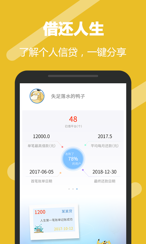 4、借还人生,即债务分析功能,系统为用户分析其债务情况,帮助用户更有序的进行借贷行为或使用分期服务。