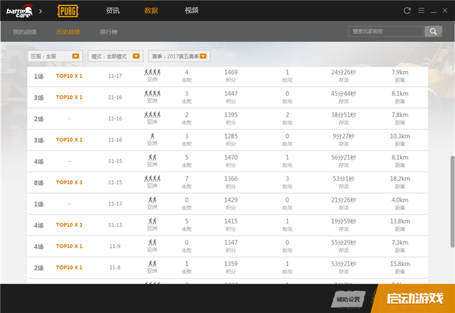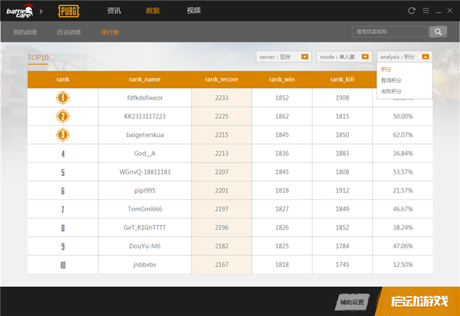 全服排行TOP10,不管是北美、欧洲还是亚洲大洋洲,一键获得各模式数据排行及吃鸡胜率,更能查看任意玩家详细战绩数据,可谓知己知彼百战不殆。