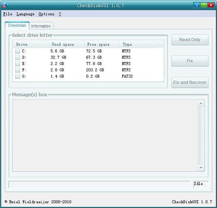 该CheckDiskGUI应用的开发要为命令行实用程序CHKDSK的图形用户界面。它可以显示硬盘和软盘上的文件系统的完整性状态,并且可以修复逻辑文件系统错误。它类似于fsck命令在Unix.operating系统显示文件系统的硬盘和软盘的完整性状态,并且可以修复逻辑文件系统错误。
