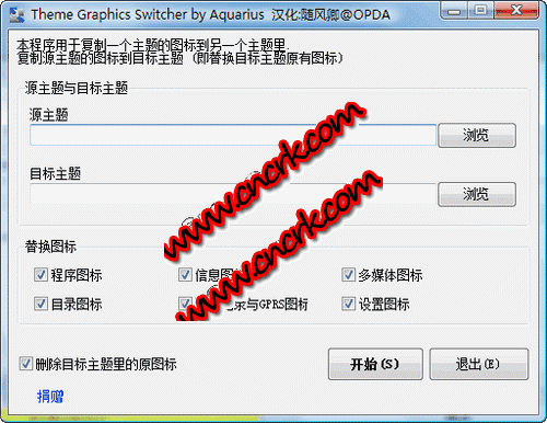 Theme Graphics Switcher是一个用于把一个主题的程序图标/目录图标/其他图标替换为另一个主题里面的图标的程序.程序要正常运行,需要一个提供带图标的源主题,还要个待修改的目标主题,反正就是得两个主题滴~