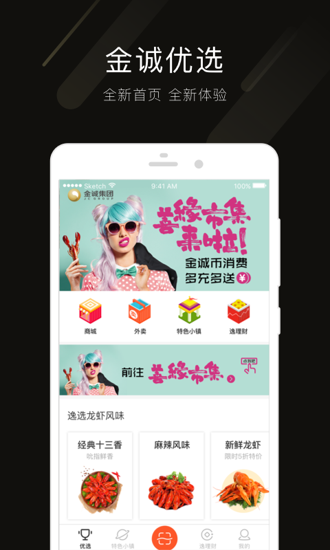 金诚逸APP集合多元商业模式,线上商城、外卖、团购应有尽有,优惠活动精彩不停!金诚肥美小龙虾,绿壳Q弹鸡蛋,生活品质尽现;