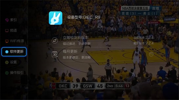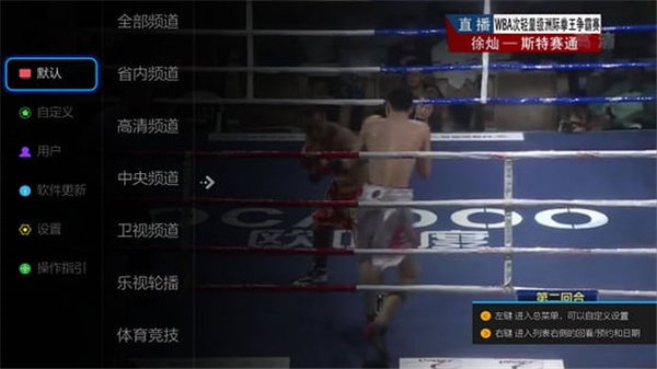 在播放画面最左侧有一个总菜单,可以进行上下切换选择自定义设置。可以在选择频道时,进行索引、启动默认频道、软件更新、地域/显示频道编号/反转上下键/自动换源/开机启动设置、查看操作指引等。