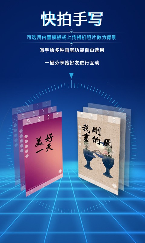 【全景拍摄】配合三次方·V拍全景相机使用,可拍摄全景照片、全景视频、缩时摄影,支持全景、水晶球、小行星、VR等观看模式,一键分享互动。【快拍手写】可选用内置模板或上传相机照片做为背景,进行手写手绘,一键分享互动。