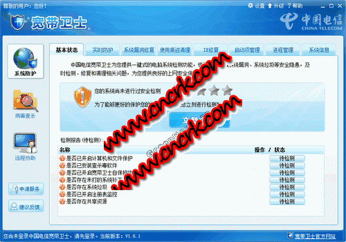 宽带卫士(中国电信宽带卫士安全产品)是集计算机病毒查杀、系统防护、远程协助三大功能的桌面软件。产品结合最新版本mcafee2009为核心的杀毒引擎,具有双向防火墙保护、全面防病毒/放间谍软件,处理速度和扫描速度快等特点,并提供免费远程协助服务,为客户提供实时快捷的贴心服务,让用户省时、省心、省事,不再受病毒与系统故障的折磨,真正安全上网,尽情享受炒股、聊天、购物、线上交易和游戏的乐趣,而且远程协助服务所花费的时间短,费用低,效率高,是帮助用户快速解决问题的好帮手