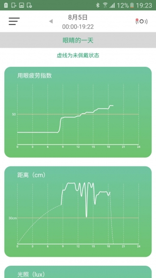 1.实时记录每日用眼疲劳指数、阅读时长、阅读距离、阅读光照和白天户外活动情况。
