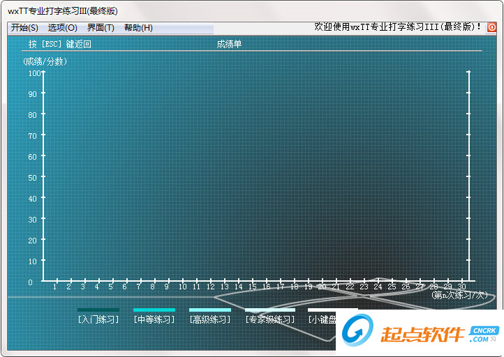 3、软件分为入门练习、中等练习、高级练习、专家练习、小键盘、成绩单等功能界面,用户可以根据自己的需求选择练习难度。