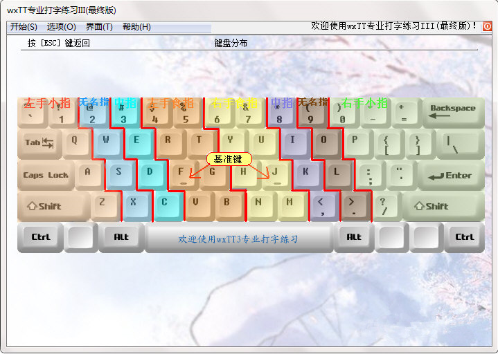 4、小键盘一般是为初学者定制,想要专心练手速的小伙伴可以选择“帮助”界面查看“键盘分布”,直接记住键盘的键位,练习盲打。