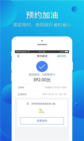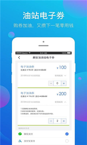 【首页】集合了附近油站、收藏油站、地理定位、导航条等入口;【购买电子加油券】选择不同面值的电子加油券,并进行在线购买,方便快捷;