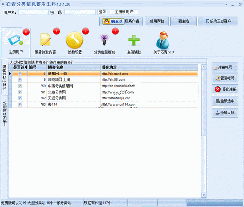 石青分类信息群发工具 一款全自动分类信息站群发软件,独创的验证码识别方式,快速发布信息,建立SEO外部链接。本软件是一款高效的分类信息群发工具,可以对国内大型分类,赶集,58等等站做群发,以及大批量的普通分类信息站做全自动验证码识别发送。客户只要录入好注册帐号,密码,以及群发内容,就可以轻点鼠标实现信息的网络覆盖。