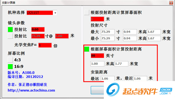可以帮助用户过选择雅图投影仪的机种,镜头参数、投射尺寸投射比、光学变焦等再根据投射距离计算屏幕面积和根据屏幕面积计算投射距离,计算投影仪的安装距离