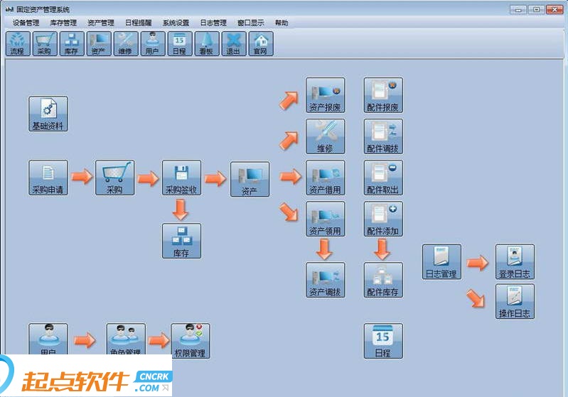 4、管理资产及配件还有办公用品,资产从采购到领用、调拔、维修、报废,电脑配件从添加到调拔、取出、报废,都有详细的记录。