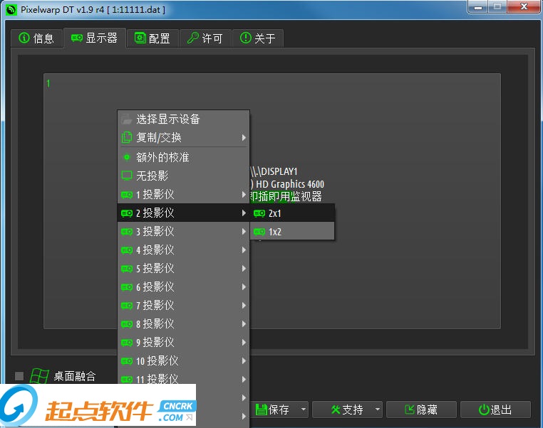 传统情况,我们一个投影仪投射出来的画面是有限的,并且画面是常规的矩形,通过此软件,可以将多个投影仪的画面无缝拼接为一个整体,并且可以对每一个投影仪的光度进行光线补偿,防止投影仪因灯泡衰老而造成颜色不均匀。有些情况,例如影院,是弧形的,我们也可以通过此软件,将画面形变为弧形的画面,让视角更加宽广,还有些情况,我们制作的影片,游戏需要做遮罩处理,也可以通过此软件来完成。