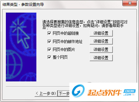 第六步:选择要在网页中搜集的结果类型,在要搜集的结果类型前面用鼠标点击打钩,可以选择多种结果。选中结果项后,可以点击该项后面的“详细设置”按钮,对结果进行更详细的设置。