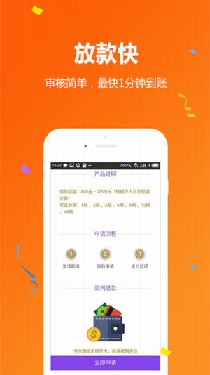 急速下款:初次10分钟,复贷3分钟到账;借款简单:门槛低、息费低、材料少、放款快。