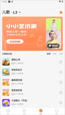3、完备的知识体系:课程全面涵盖语文全科知识,涉及拼音、古诗、阅读、表达、国学、识字、写字等诸多主题。L3阶段的课程,对千余字词以及古诗知识等均有覆盖,能有效引导孩子积极开口、乐于练习。