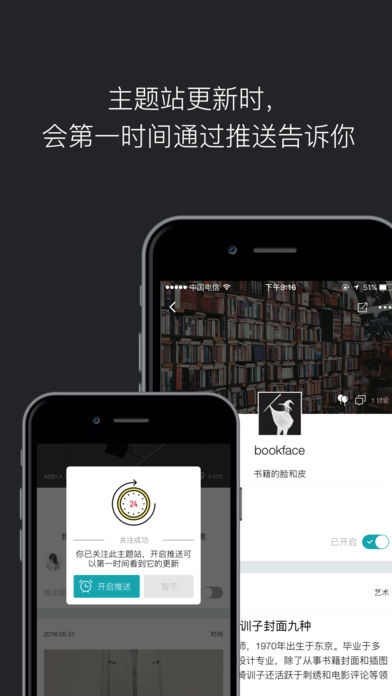 - 自由设定主题站内容更新的推送,轻松把握自己关心的优质信息
