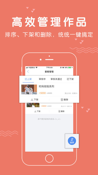 消息栏:新消息弹出提示,随时随地回复顾客咨询,不放过每个成单机会作品管理:已发布作品一键管理,上下架情况轻松掌控,作品未通过原因即时反馈,原因查看一目了然