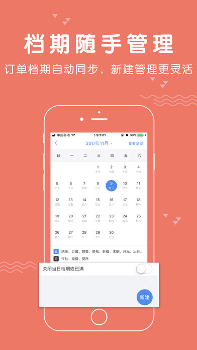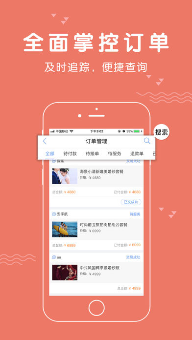 订单管理:订单状态清晰分类,接单改价方便快捷,预约到店功能,顾客来访提前联系,日程安排更顺心