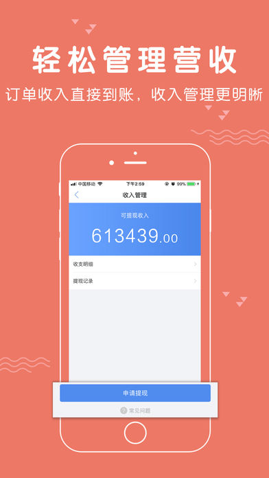收入管理:查看订单收入详情和资金流向,账目管理帮你搞定,账户余额随时提现