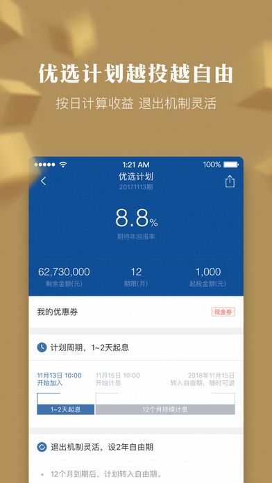 1、注册即享880元新人红包,等您来领。2、新人投资专享预期年化利率10.0%新手标,锁定期1个月。
