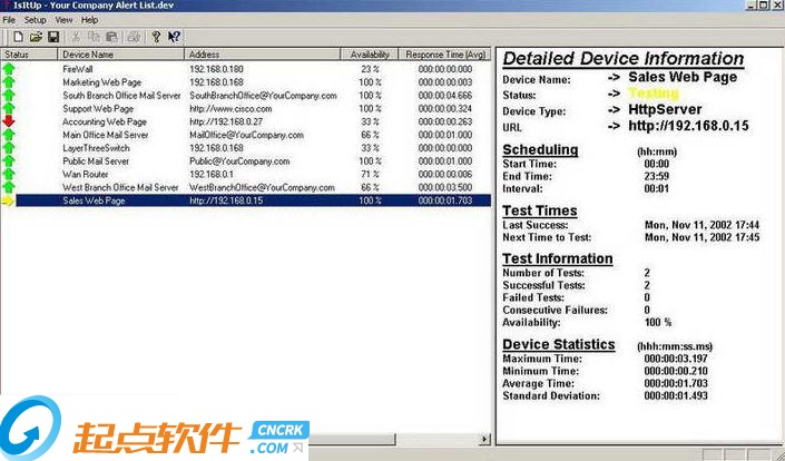 IsItUp 采用了 TCP/IP 网络中的 ICMP 探测讯息以判断网络上的某台主机或设备是否停止运转了,它也可以藉由 ICMP 探测讯息传回所需的时间,得知网络或远程主机的讯息处理能力是否有下降的趋势。IsItUp 也提供了对电子邮件服务器的测试功能,可为你确保企业内重要的电子邮件服务器常保运作正常。