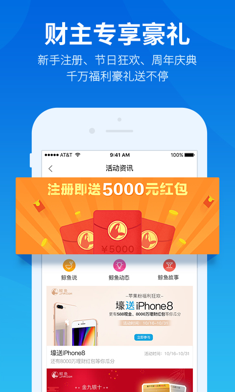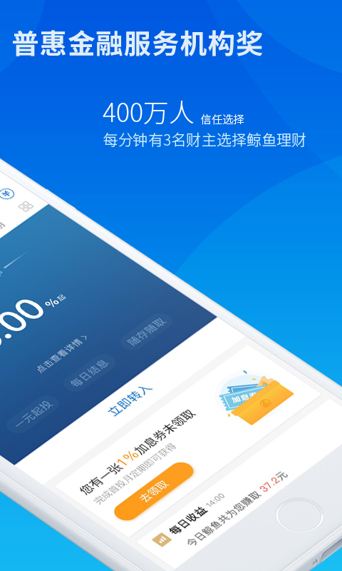 鲸鱼-鲸鱼金融旗下专注服务低风险投资爱好者的普惠金融新工具,安全运营三年,368万用户信赖之选,每分钟有3名财主选择鲸鱼理财。在泛资管时代背景下,鲸鱼突破传统金融机构资产管理的高门槛,让专业级的投资管理、风险管理、财富管理,用普惠金融的价值观,为更多人提供专业的、值得信赖的创新金融服务。