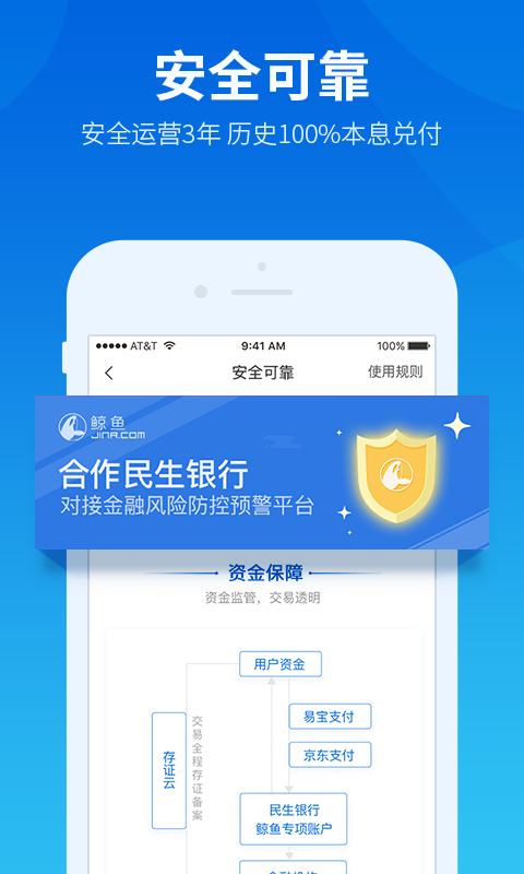 鲸鱼在民生银行开设专项账户,用户投资资金通过易宝等第三方支付通道进入民生银行专项账户再由民生银行专款代付到指定项目中,整个交易流程由金融风险防控预警平台“存证云”进行全程存证备案。