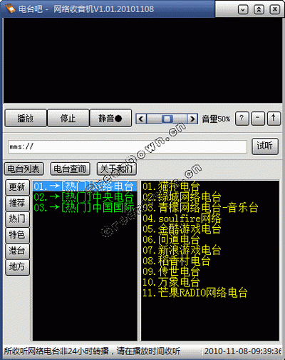 电台吧网络收音机 V1.01 简体中文绿色免费版 电台吧-网络收音机是一个免费软件。随着宽带网的普及,网速越来越快,网络上听广播已不成问题。使用电台吧-网络收音机,只用鼠标轻轻一点,就能听遍全世界的声音。内建有100多个中文电台(包括国语、粤语)及一些国际著名电台。程序已经内置了在线更新电台信息,收录全世界多个电台,可以听财经、娱乐、社会新闻,听外语电台,听流行曲,享受摇滚、爵士、民乐、交响乐等