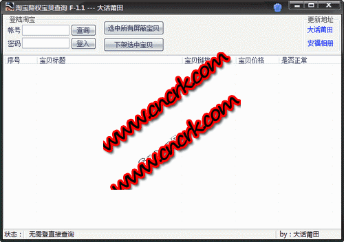 大话淘宝屏蔽降权查询软件 V1.5 简体中文绿色免费版 淘宝宝贝屏蔽查询软件,淘宝自上次更新以来,规则变化已不再是时间到期下架卖家宝贝,而是屏蔽宝贝在淘宝上的搜索显示。