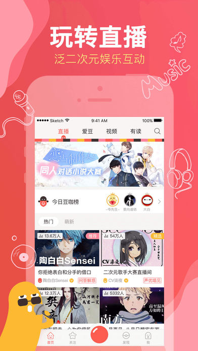 【直播】红豆Live首创声图共享的直播模式,主打二次元、星座、情感等娱乐互动直播,这里有国内的人气CV、唱见、coser、画手、星座、情感主播为你带来精彩的直播内容,二次元的年轻小伙伴都在玩,你也快来吧!