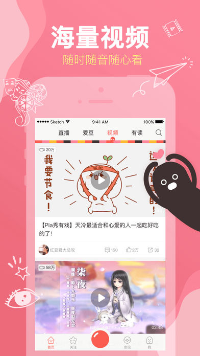 海量UGC原创视频等你来勾搭,更有颜团子、破耳兔等众多萌物和你激萌Pia戏,满足你的表演欲,建立专属录音棚,用自己的声音做大片。