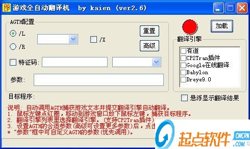 1. 鼠标左键点红圈,移动到游戏窗口放下鼠标左键,捕获目标程序。2. 翻译引擎列表里选择翻译引擎。(支持CP2Tran插件)