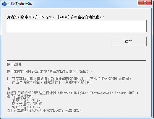 引物Tm值计算:请再本软件中输入引物序列、如果您输入的序列中没有有ATCG字符,会没自动过滤