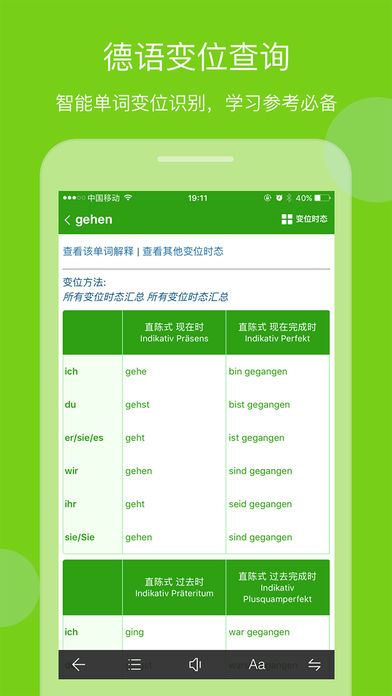 - 德语动词变位查询,提供17种时态的动词变位反查功能;