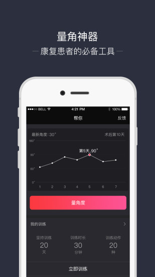 【计时器】不同关节损伤患者可根据自身情况定制个性化计时器,帮助患者进行康复训练组合动作的计时【量角】通过量角工具来帮助患者测量关节活动度,测量术后的角度恢复情况,并能清晰的了解每天的康复进展,并根据康复的阶段智能推荐该专业医生提供的康复知识和需要注意的事项。