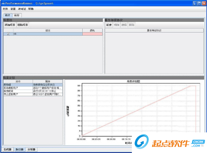 场景设计视图中包含了三个部分,分别是场景组管理、预期指标管理、场景计划管理,可以为该场景添加虚拟用户的数量以及虚拟用户启动、停止的规则,还可以设置IP欺骗,远程监控服务器等。