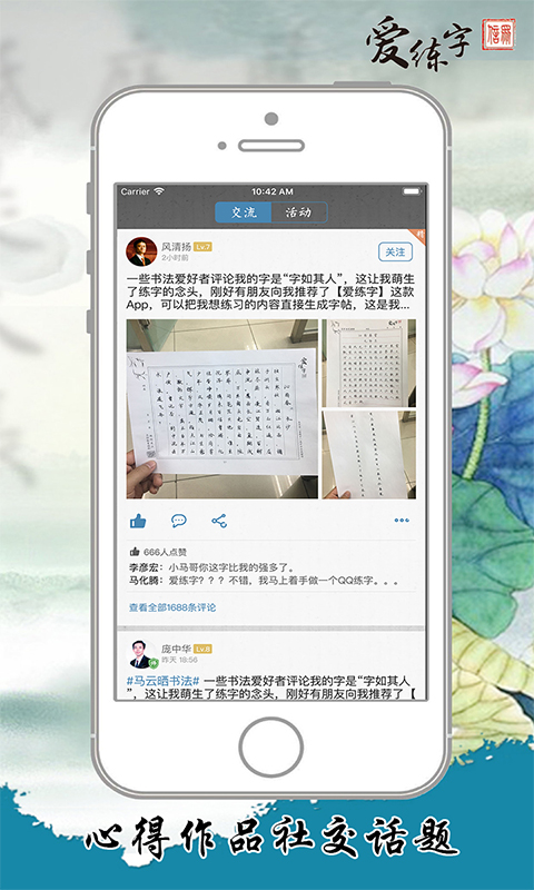 5、书法同好交流:社交功能上线,快来跟同好一起交流书写心得,展示练字作品,引爆话题讨论。